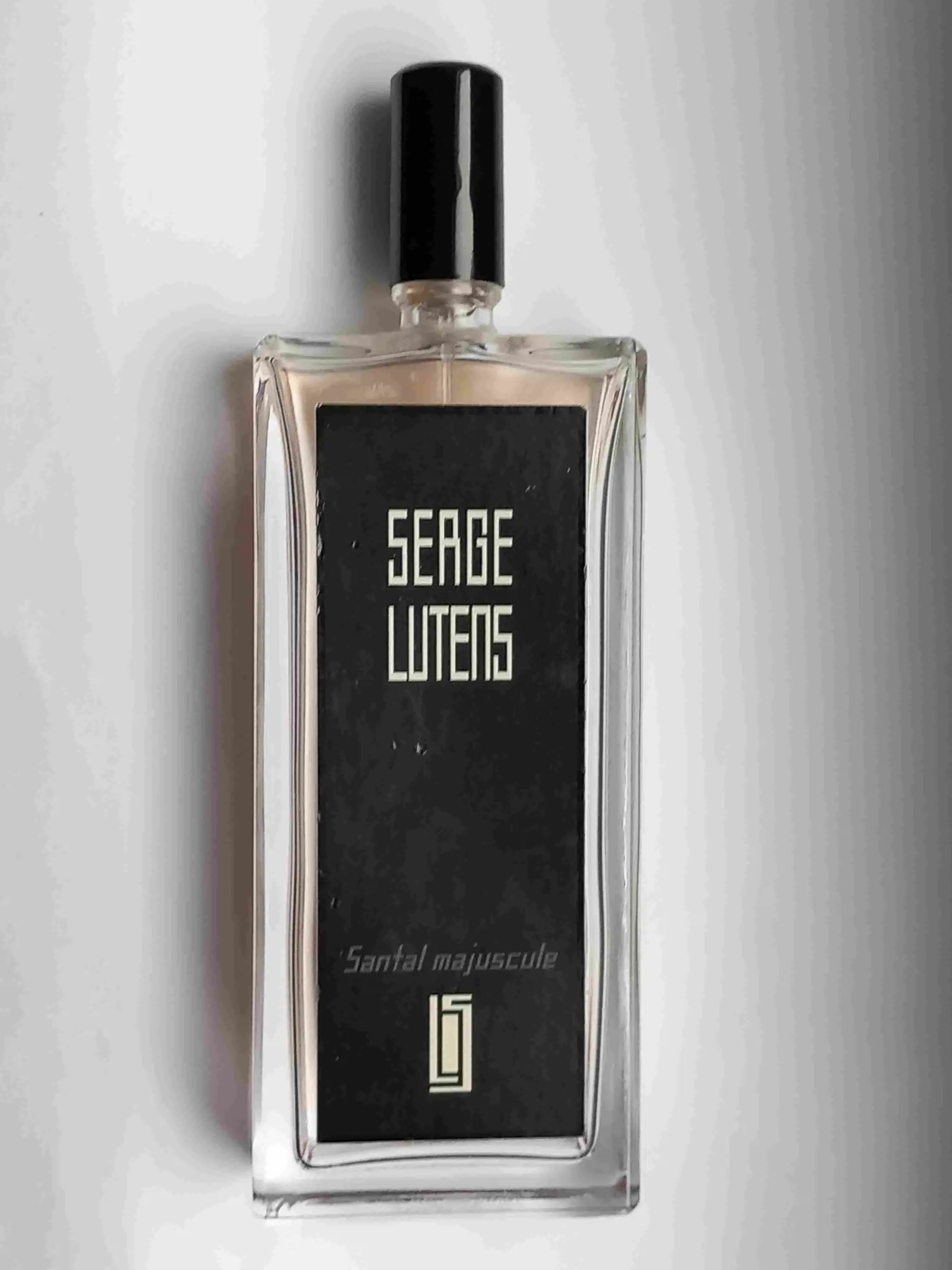 - Serge Lutens – Santal majuscule – un miros cald de lemn dulce, tomnatic, coniac, rom, intim, genital, lactic. Miros de frunze ușor ruginite, atmosferă elegiacă peste care un vibrafon împrăștie împăcare.